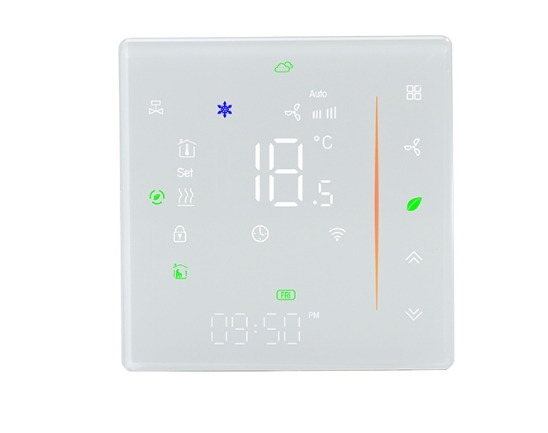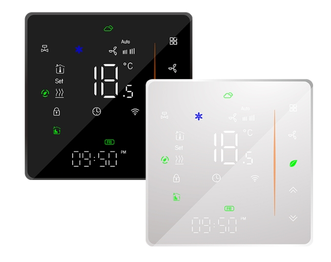 Termostat inteligjent i linjës 006 për kontroll të ambientit në sisteme fan-coil, ftohje & ngrohje, me lidhje WiFi/Modbus/ZigBee, aplikacion SmartLife, programim 5+1+1 dhe dizajn modern me ekran të prekje.