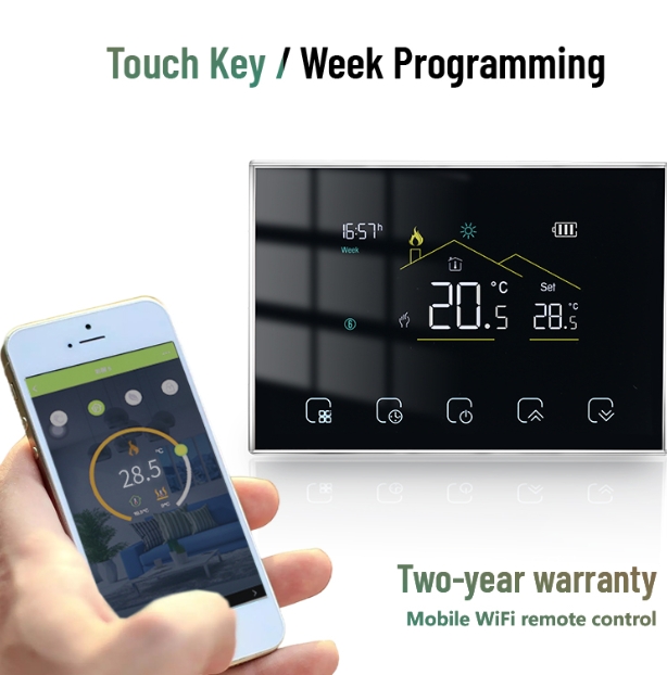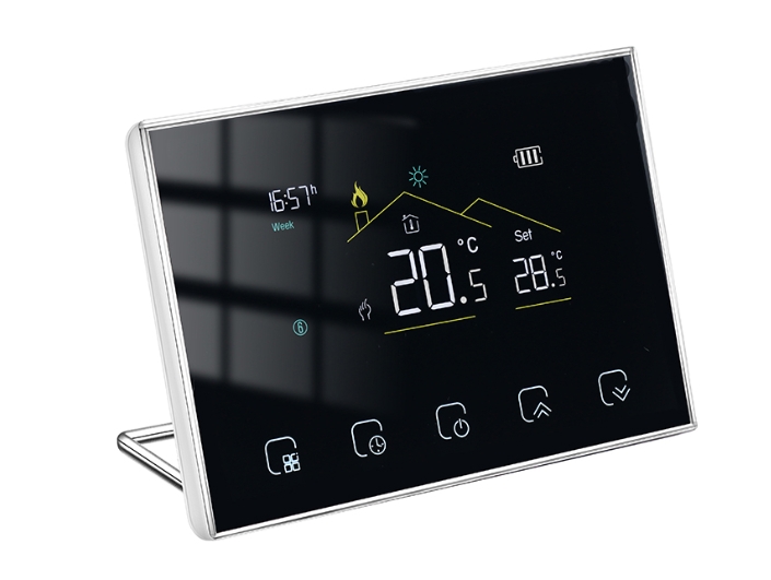 Termostat inteligjent 8000RF me kontroll nga distanca, lidhje WiFi dhe RF, programim javor 5+1+1, dizajn elegant me ekran LED dhe ndërfaqe intuitive. I përshtatshëm për përdorim rezidencial dhe komercial.